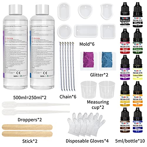Wat je krijgt: Fansarriche-harskit bevat een fles hars van 250 ml en een fles verharder van 250 ml, 6 verschillende vormen van mallen en 6 kettingen, 2 glitters, 2 maatbekers, 2 houten stokjes, 2 druppelaars, 10 harspigment (wit, blauw, paars) , Zwart, Groen, Goudgeel, Rood, Citroengeel, Oranje, Koffie) en 1 handleiding, die zeer geschikt is voor professionele artiesten of beginners.